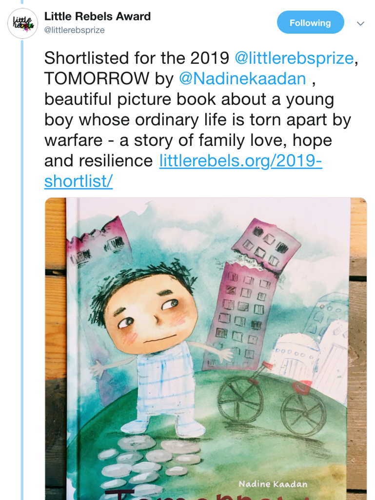 The Little Rebels Children’s Book Award is a prize for “radical fiction aimed at children aged 0-12,” and Syrian children’s-book author and illustrator Nadine Kaadan made this year’s seven-book shortlist with her self-translated picture book Tomorrow, published by Lantana.